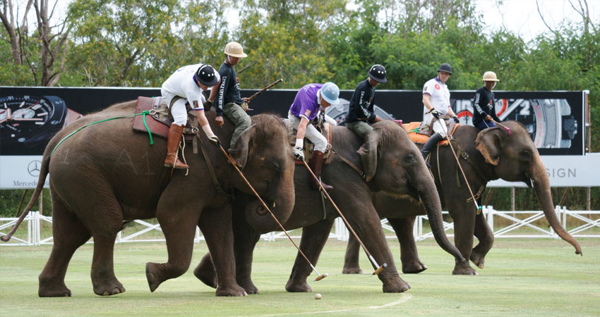 A fast (at times), exciting game, like polo but with elephants and longer sticks, this is quite possibly the biggest sport in the world.The game is played by four players of each team on a marked pitch 140 x 70 meters, using a standard size polo ball and consists of two 10-minute chukkers of playing time, with an interval of 15 minutes. The whistle blown by the referee stops and starts play. The pitch is marked with a centre line, a circle with a radius of 15 meters in the centre of the field, and a semi-circle with a radius of 30 meters measured from the centre of the goal line at either end of the pitch. Elephants and ends are changed at half time.